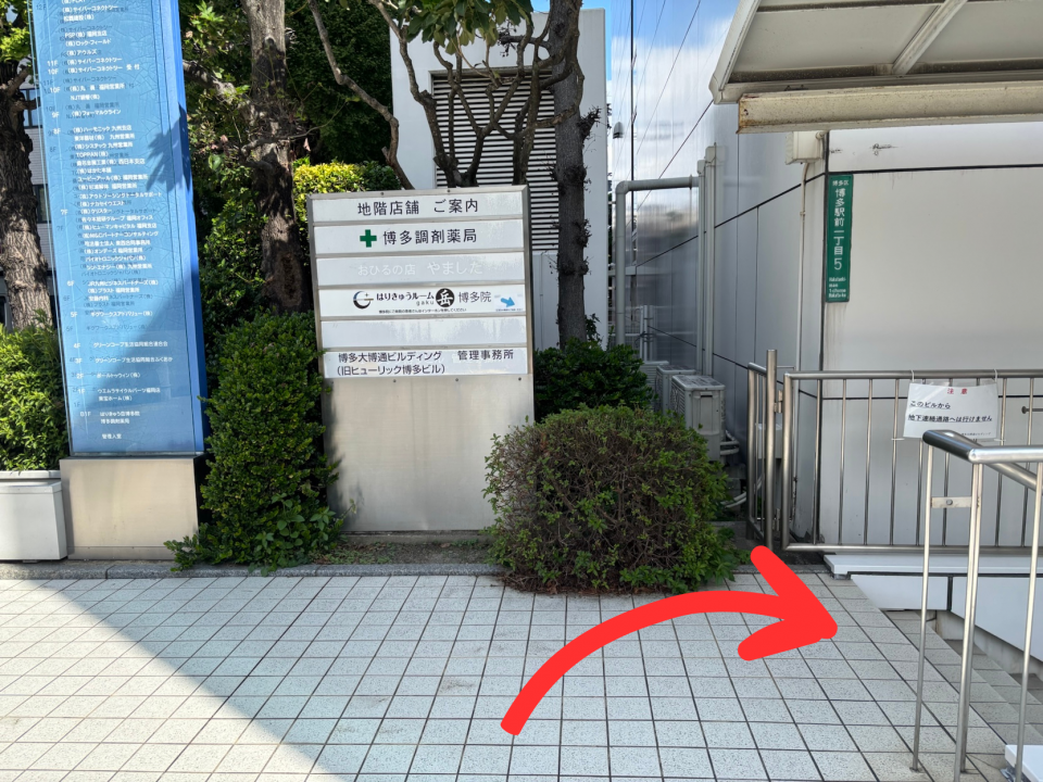 7.交差点の右手にこちらの看板があります。その横の階段を降りてください。